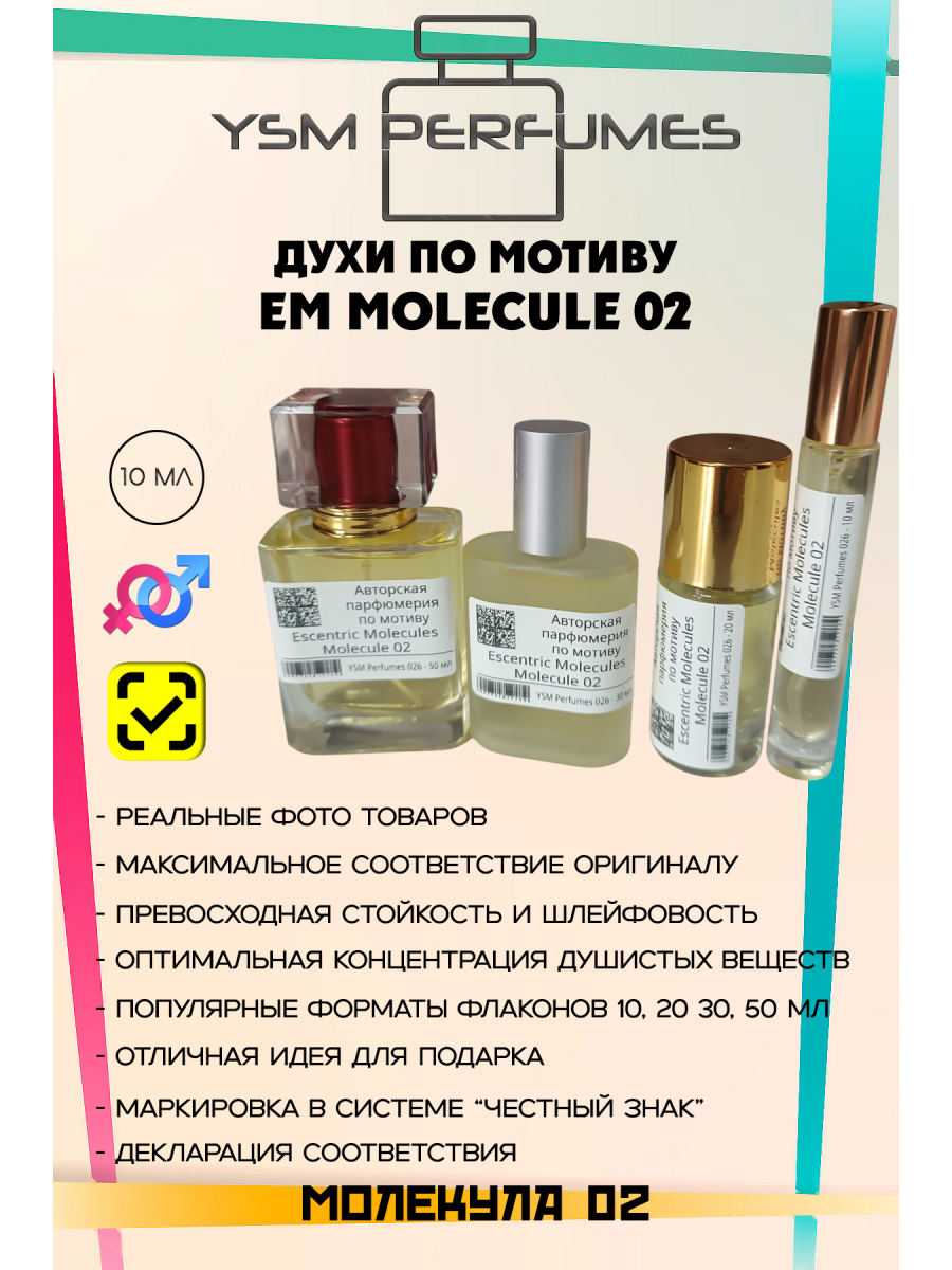 Не тестируйте на блоттере (бумажке): На бумаге Molecule 02 почти не пахнет или пахнет спиртом. Ей нужно тепло кожи, чтобы «завестись». Аносмия: Некоторые люди генетически не способны чувствовать запах амброксана. Для них этот флакон будет пахнуть «просто спиртом» или «ничем». Не путать с Escentric 02: Molecule 02 = чистый амброксан (спокойный, тихий, телесный). Escentric 02 = амброксан + ирис + жасмин (более яркий, цитрусовый, морковно-ирисовый запах).