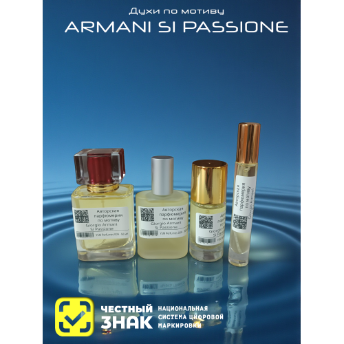 Захватывающий мощный аромат высшего класса открывается сладкими фруктовыми нотами сочной душистой груши, пьянящих ягод черной смородины и свежим утонченным аккордом розового перца. Роскошное цветочное «сердце» композиции мягко струится оттенками изысканного белого жасмина, чувственной бархатисто-пряной медовой розы и сладостным цветочно-ванильным акцентом гелиотропа, которые страстно сплетаются в шлейфовых нотах парфюма Armani Si Passione с теплыми мягкими сливочно-хвойными оттенками древесины белого кедра и восточной интригующей пряно-сладкой капелькой ванили.